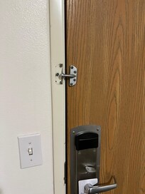 Unfortunately, that wasn’t the only issue. The secondary interior lock (swing bar latch) was completely broken off, leaving no added security beyond the deadbolt. The room was also noticeably run down and poorly maintained. The shower had deteriorating, missing caulking, and the closet had an exposed opening where I could see directly into the plumbing and backside of the shower.