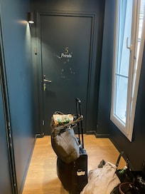 After entering, there is a modest breakfast room with available small snacks and tea and coffee. There is a very narrow dark hallway to the room. The room is very small with virtually no space to put anything. There is no shelf space to speak of in the bathroom. Everything was clean, however. There were sufficient power outlets, including USB. There is no actual air conditioning, only a fan. There was no one in attendance when we arrived.