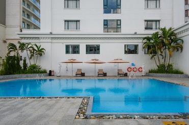 The hotel showcases a shimmering outdoor pool with dedicated children's area. Comfy loungers and chic umbrellas create the perfect poolside relaxation spot.