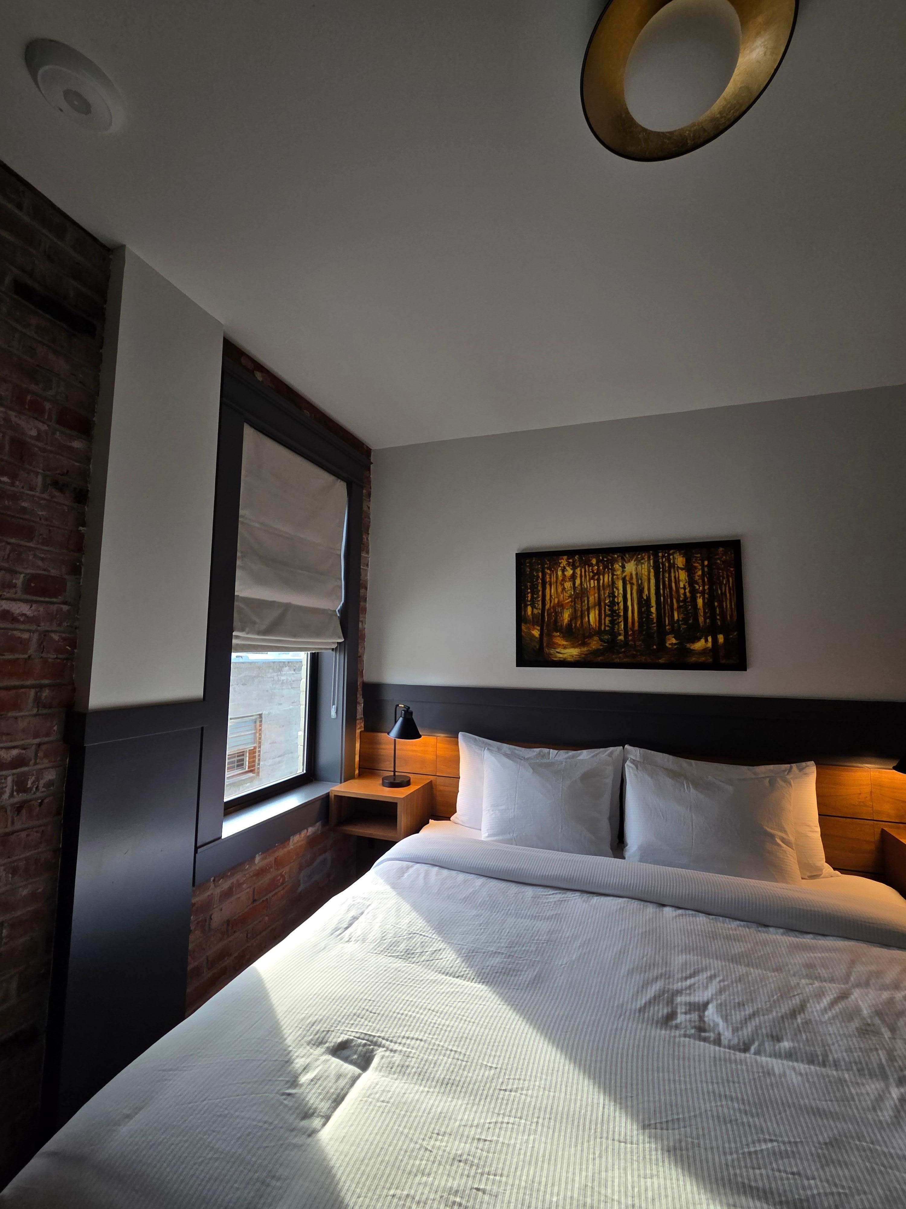 That being said... It is a boutique hotel, newly renovated building, but it's obvious the rooms are maximized for quantity, which really gives up on comfort. We got a king alley room (which isn't event he smallest sqft) and you could barely move around the bed, if we'd had more than weekend backpacks, IDK what we would have done. There is no bathroom fan or window. There is no room fan, and the minisplit is set to not allow air circulation (only hot or freezing air). The window is a foot from the bed so when it's below 40 out, we wouldn't sleep with the it open. I beg the developers to sleep here for a night and think about how people actually live.