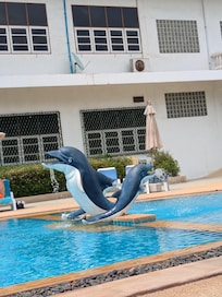 靠近步行街的酒店,设有室外游泳池