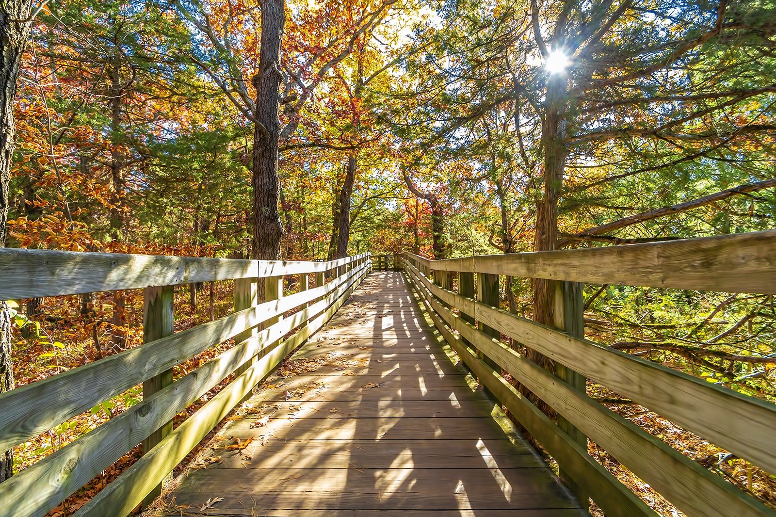 Starved Rock State Park, IL, is a scenic natural area known for its canyons and its towering bluffs, which often feature sparkling waterfalls and leafy trees. Given the amount of trees and flora in the area, autumn is the most popular season to visit, as you can see the array of red and orange colours all across the park.