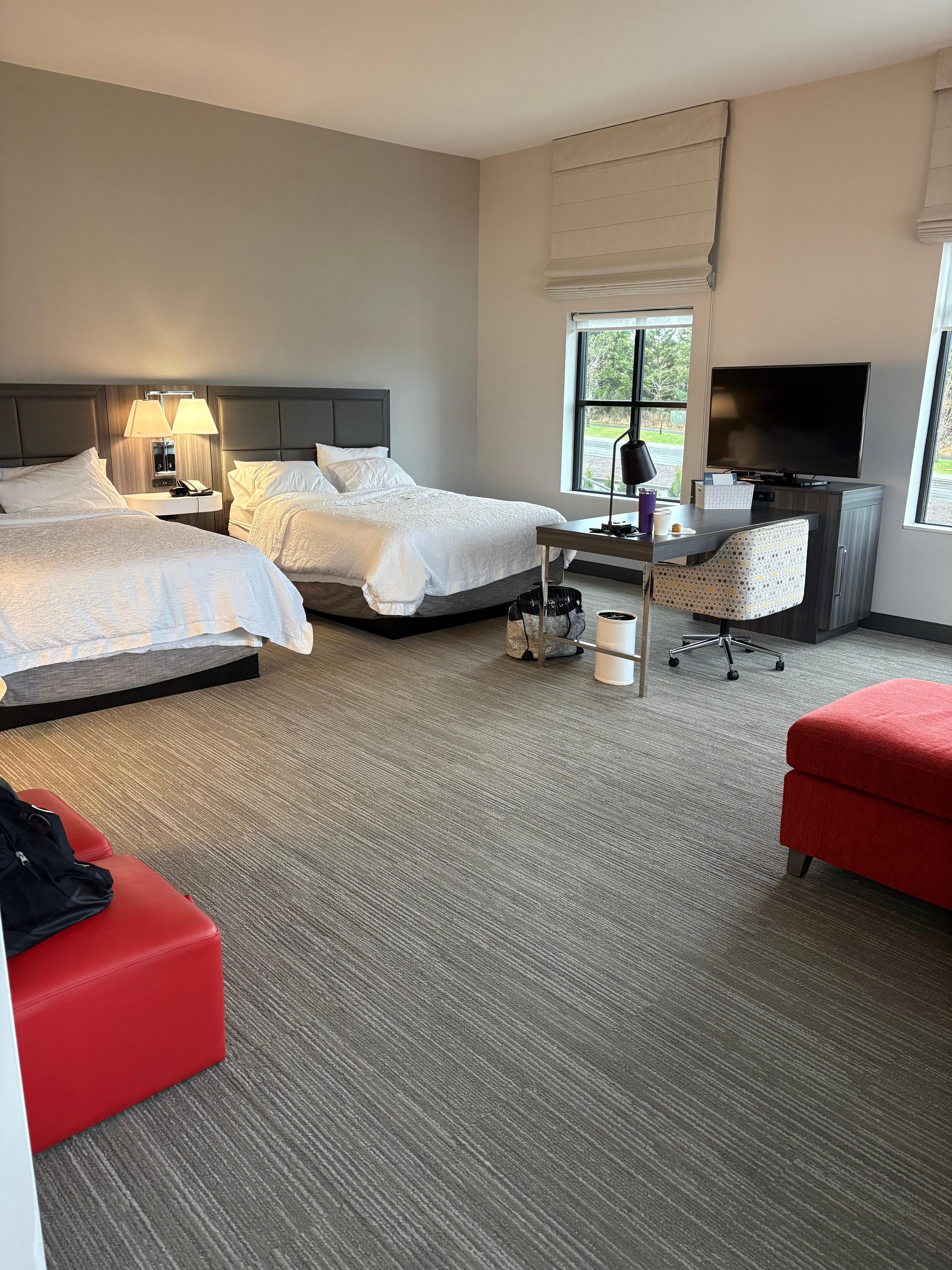 Room was very clean. Staff very nice and helpful. Irequested as quiet a room as possible for my stay with my dogs so we wouldn't hear the storm blowing through. My room wasn't ready when I arrived so they upgraded me to a lovely suite. Kept me near the exit for my pups too! Great experience!