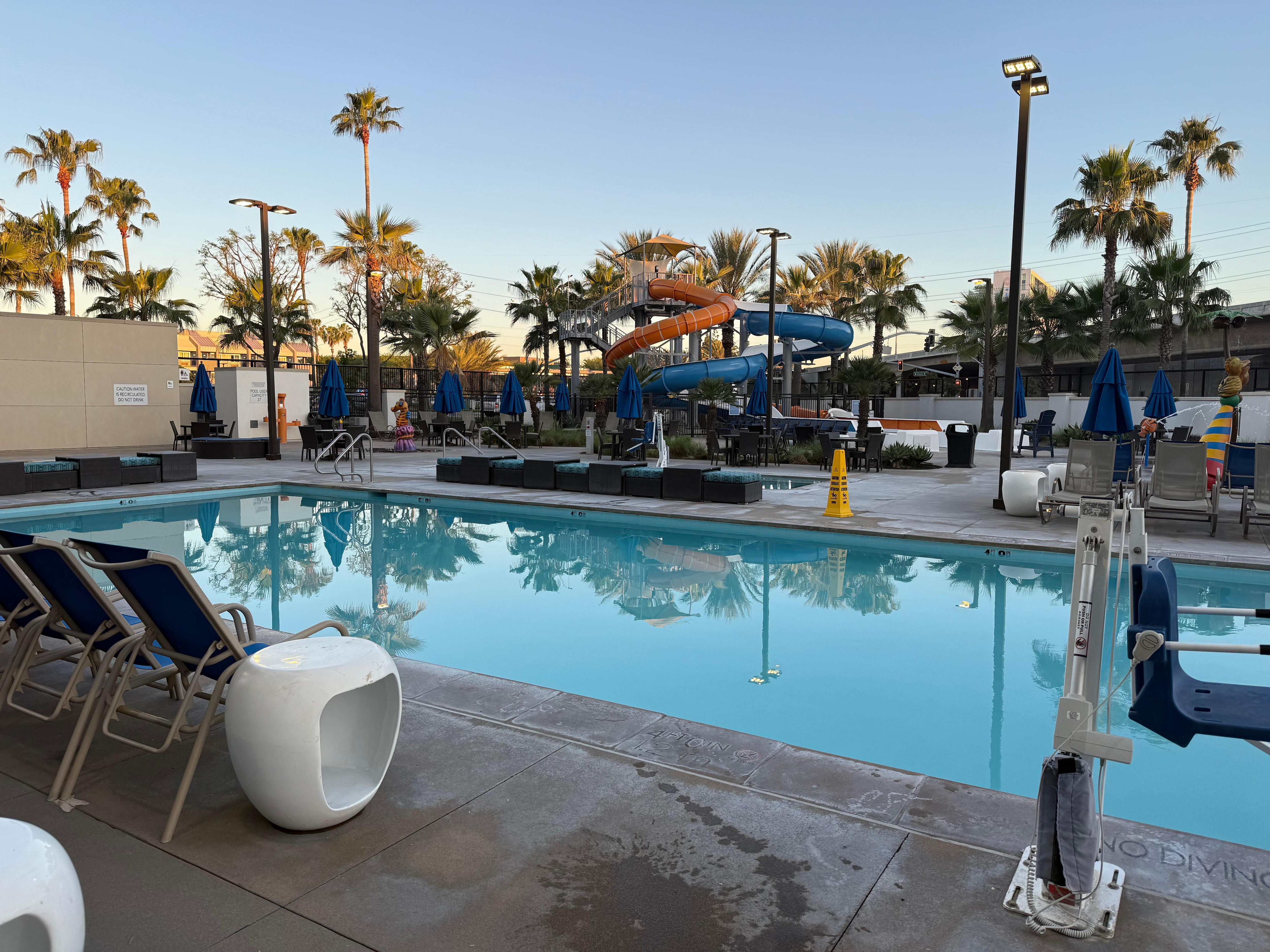 The location to Disneyland is a little further down. But you’re not having to deal with all the crowds walking around while trying to get to your hotel. You will need to use the shuttle. The hotel is clean, friendly staff, beds are comfy. Security is good. You must use your room card to be able to use the elevator and you can only go to your floor. Your room key doesn’t allow you access to other floors) The breakfast they serve is just okay. There are plenty of restaurants to go eat at across the parking lot to the hotel. (Habit Burger, Starbucks, Ono Hawaiian Bbq, Yogurtland, and two others).