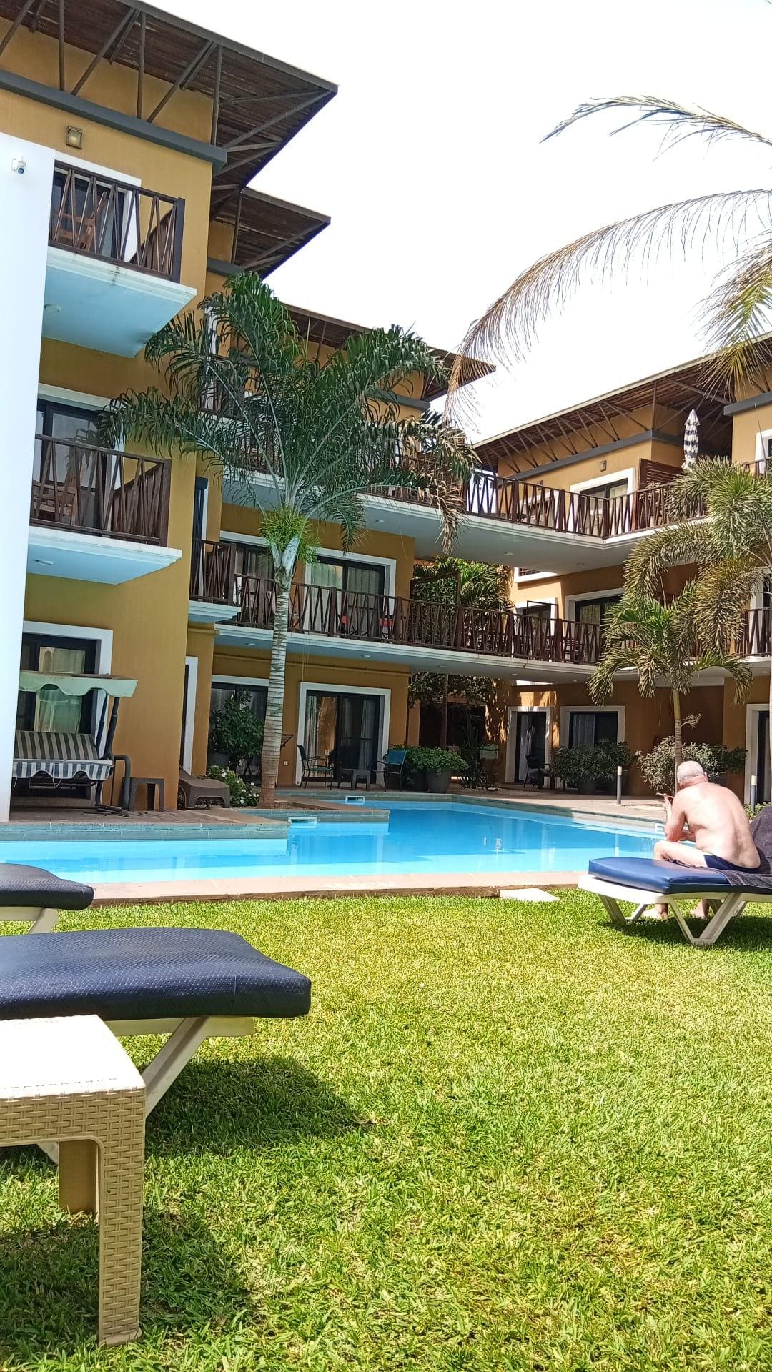 Nice apartment although a little ragged around the edges. Fairly clean but some bugs (it’s The Gambia!) No water one morning and very low water pressure on another meant two mornings couldn’t have a shower which was met with no real response from the staff. People around pool can be noisy at night which security don’t deal with. Large charge for a 4 hour late checkout for a returning customer who stayed nearly 2 weeks shows their customer service know how! Manager made it very clear he really doesn’t care! Quoting rules and terms at you before just walking away without resolution All in all, it’s an ok place but the lack of CS means unlikely to return.