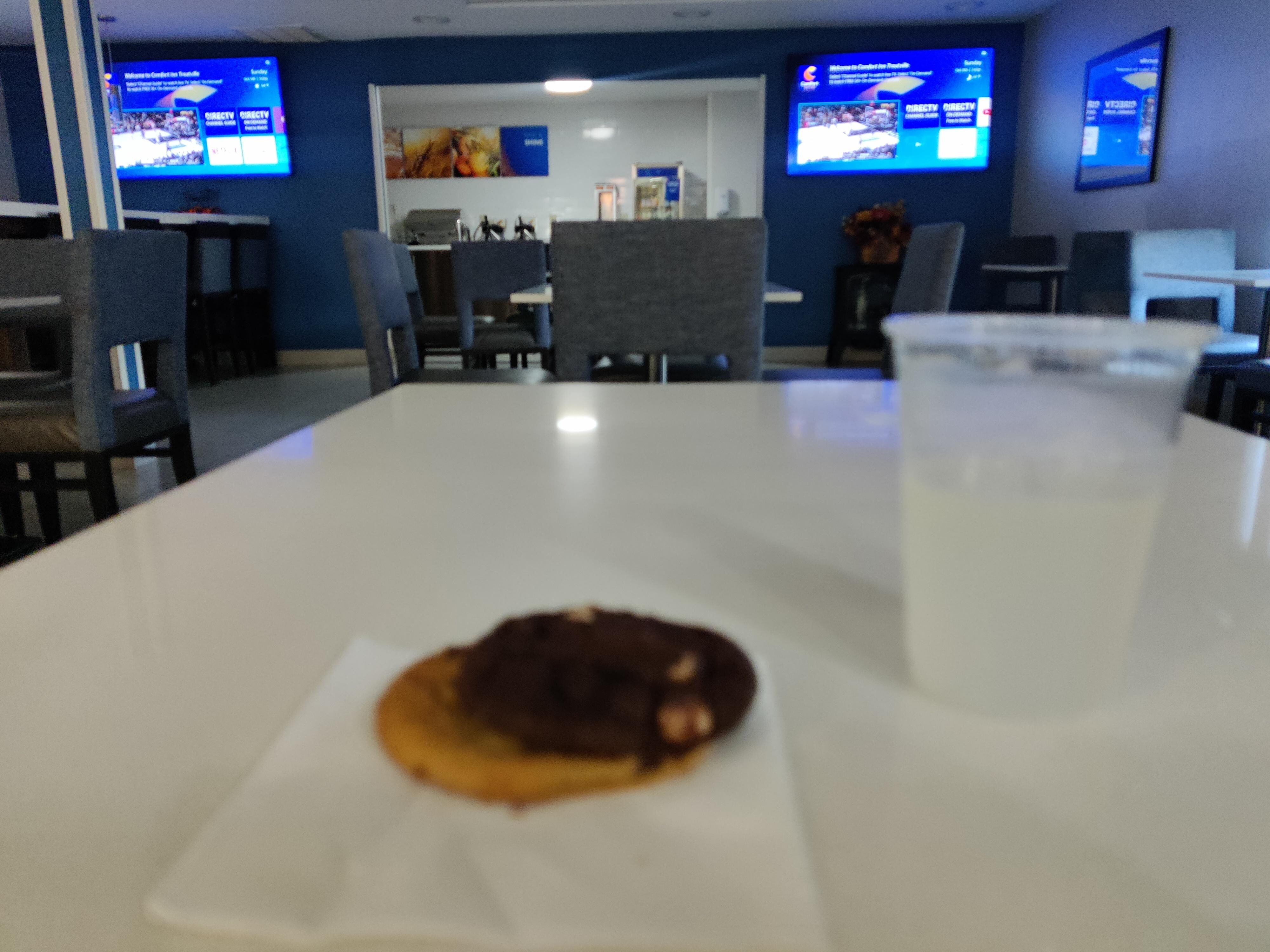 The wifi login is cumbersome, requiring logging in, then watching a video commercial prior to joining. The clerk said there would be cookies and coffee available until 10 PM . . .when I went to the lobby at 8 PM there were no cookies. When we returned to the hotel at 9:35 PM there we no cookies available. Why say they would be there if there was no intention of having them?