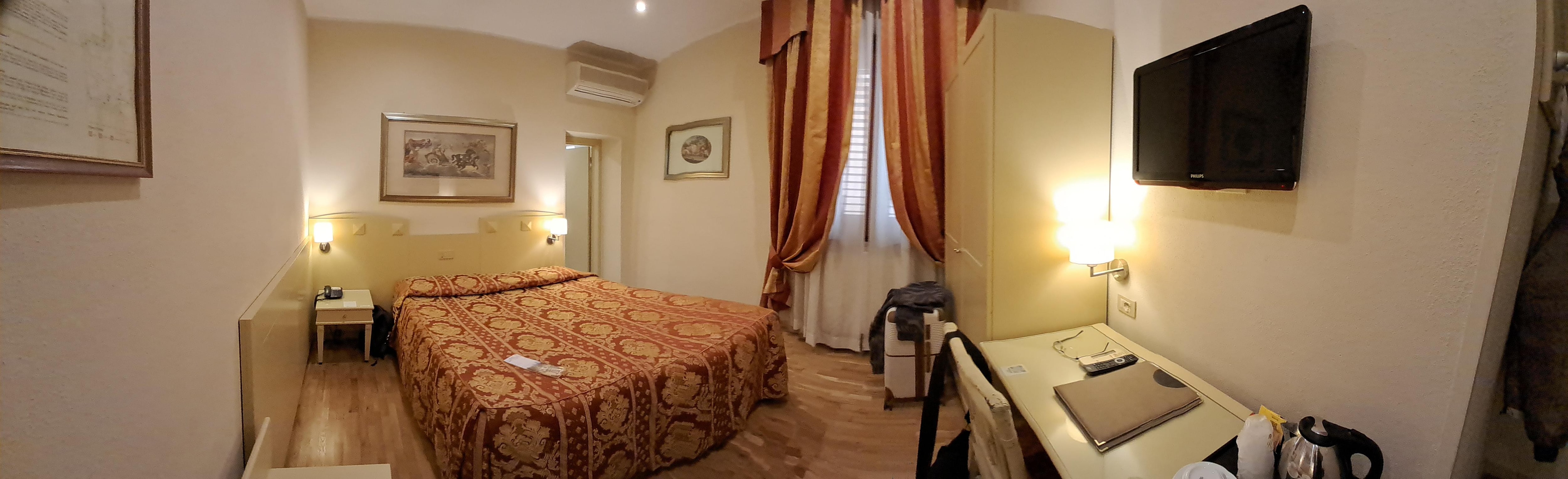 Um hotel 4 estrelas mas que se enquadra de 2 a 3. Os quartos precisam de reforma e remodelação. Tem paredes com manchas, a cama range demais com qualquer movimento, o banheiro é muito pequeno, principalmente o box, o edredon da cama não tem capa o que deixa a duvida se é trocado para cada hóspede. O café da manhã é razoável mas com pouca reposição. Se o hotel não se qualificasse com 4 estrelas, muitas dessas observações não se aplicariam pois são comuns em hoteis 2 ou 3, estrelas. O pessoal é muito atencioso e tem um transfer para o aeroporto por 7,50 euros por pessoa