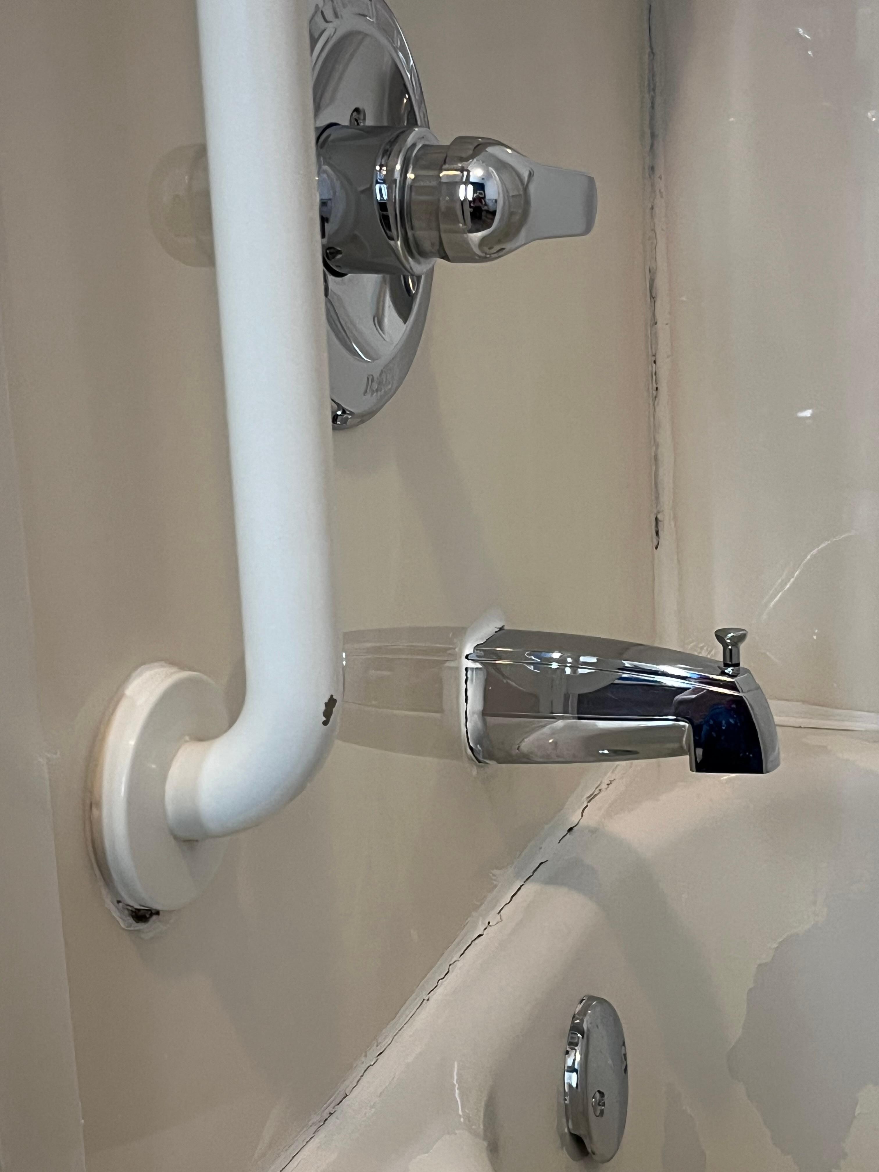Black mold or mildew around the tub. Paint chipped off the grab bars. A hole in one door. Tub finish was peeling off where it had been painted. Floor popped like it needed to be glued down. Smelled like a bottle of Pine Sol had been poured at the entrance.