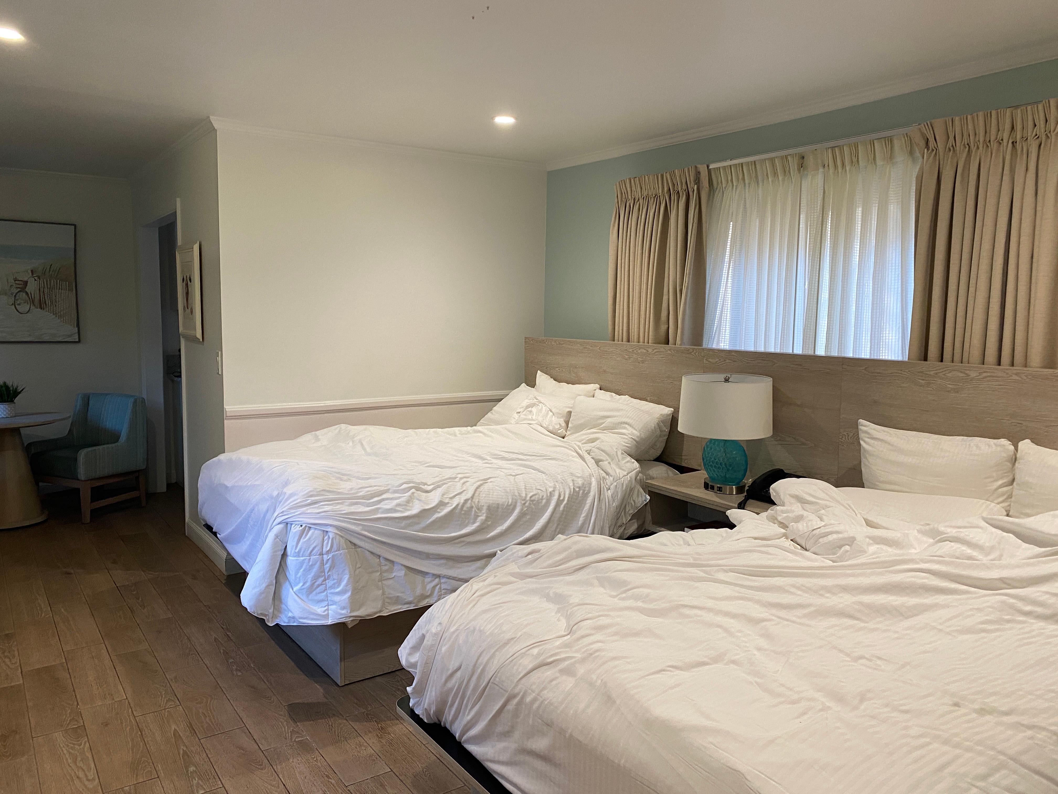My husband and I came to stay here for our honeymoon and we were so happy. Mickey, who checked us in at the front desk, was delightful! We got upgraded to a room with a patio (I don’t even think they knew it was our honeymoon, so that felt really lucky) and everything was clean and lovely. There was a full kitchen and full size refrigerator, a desk, robes, champagne glasses and an ice bucket, and a TV with a DVD player. This place has free dvd and bicycle rentals from the sister property next door, and we used both! We loved taking the bikes around town. They were all in good condition and had baskets on the front. I also loved the free breakfast in the morning and wine and cheese happy hour in the evenings. We felt right at home, and we would absolutely come back here again in the future. I forgot to mention that it’s VERY close to the ocean. On our first night, we did a full moon walk by the beach all the way down to the end of the wharf and had a romantic time snuggling and listening to seals barking. We spoke to a few people around town and when we mentioned Inn by the Harbor, everyone’s reaction was “that’s a lovely place to stay!” and we couldn’t agree more. Thank you Mickey and team!!