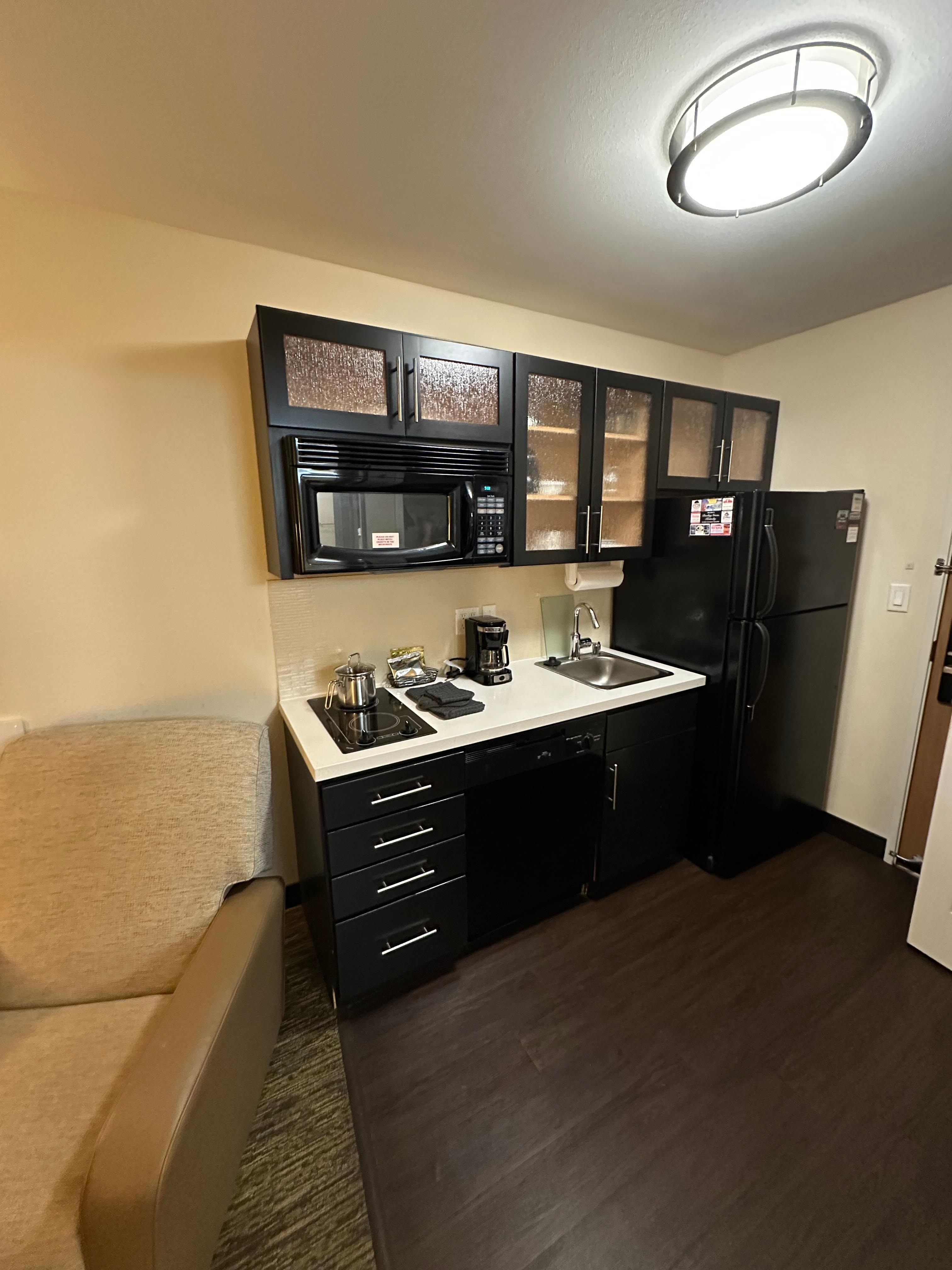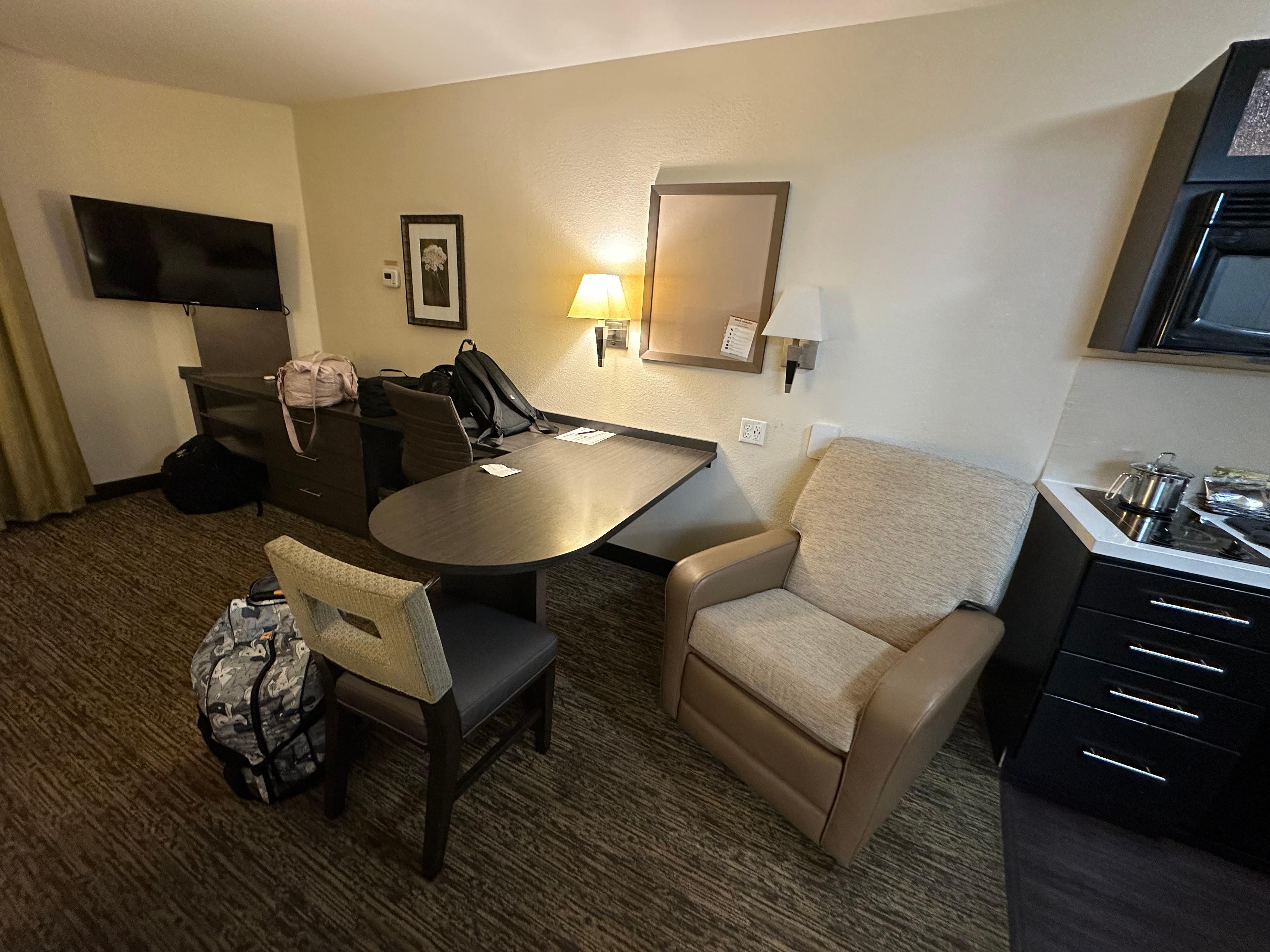 This hotel is extended stay with kitchens. The food smells where overwhelming and in our room. Also, the bathroom has hair on the tub and counter.