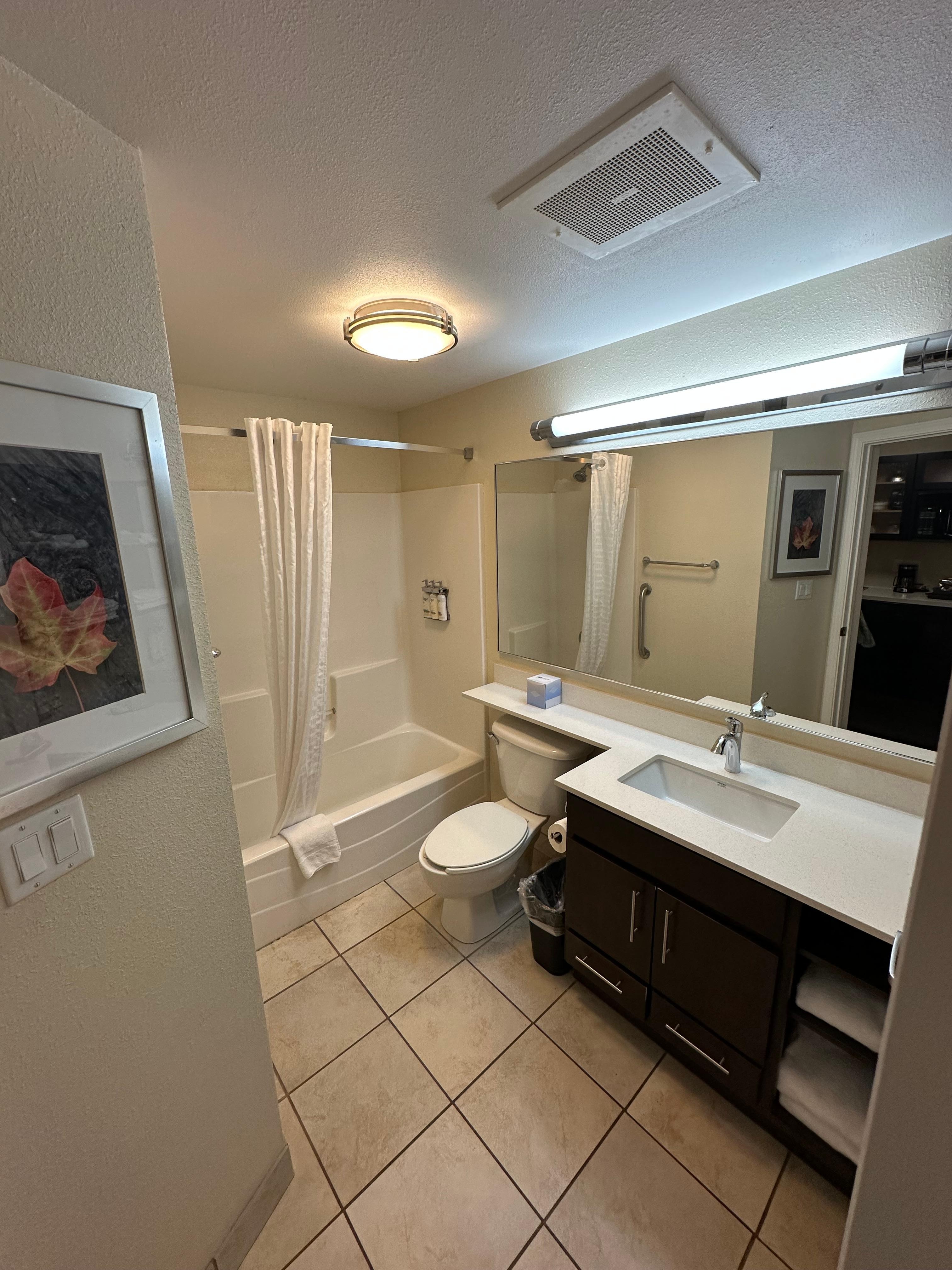The room was clean and spacious, the bathroom could use some updating. Overall a good stay for the price, there’s a kitchenette in the room and a section in the lobby to return items for use.