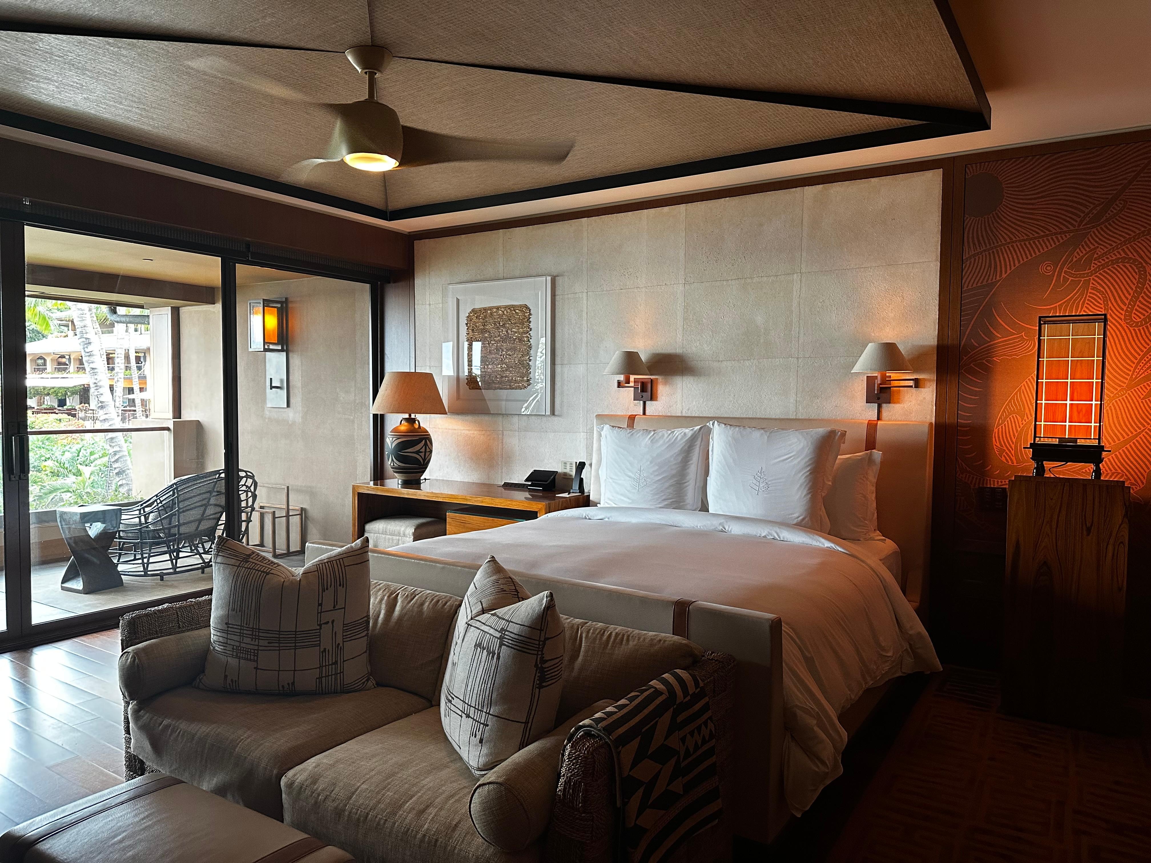 四季在拉奈岛上有两个度假酒店,一个山上,一个海边,平时半小时至一小时有班车来回穿梭,所以等于有住一家有两家的享受!去打高尔夫,来回机场,去小巿中心都有免费班车,非常方便!我们住的套房很大,布置也很有特色!酒店提供的活动很多,晚上还有音乐演出,免费的wifi,还有游戏室可消磨时间。虽住不少人,却让人觉得很安静,一点也不拥挤,我们全家都很喜欢这次的住宿经验。