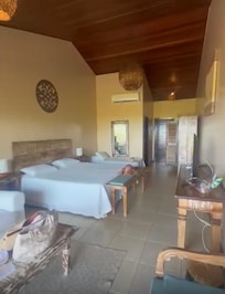 O quarto é bem arejado e espaçoso, com chuveiro ótimo e banheiro muito bom. A iluminação é um pouco baixa, mas entendo que faz parte da proposta mais rústica do ambiente, o que deixa tudo aconchegante.