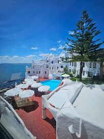 O hotel tem uma localização e uma vista maravilhosa, mas está bem mal mantido. O chuveiro do banheiro não funcionava, só a saída de água da banheira. A descarga estava com vazamento. No corredor, um vazamento do teto molhou todo o corredor. Não havia garrafa de agua na geladeira. A piscina aquecida estava meio vazia e a hidromassagem ficava para fora, espirrando agua e fazendo muito barulho. Inclusive contratei uma massagem (Silvia, excelente) mas o barulho da hidromassagem atrapalhou. Pedi para desligarem e disseram que não podiam, pois desligaria o aquecimento. O café da manhã tinha os itens básicos. Pedi ovos fritos na manteiga e fui gentilmente atendida, pois expliquei que tinha intorelancia a oleos vegetais e não poderia comer os ovos mexidos que já estavam preparados. Em relação aos ammenities, somente sabonete em barra. Para um hotel de 800 reais a diária, deveria ser muito melhor. O que vale mesmo é a localização e a vista do mar e do por do sol, com a leitura do poema na cerimonia do sol. Imperdível.