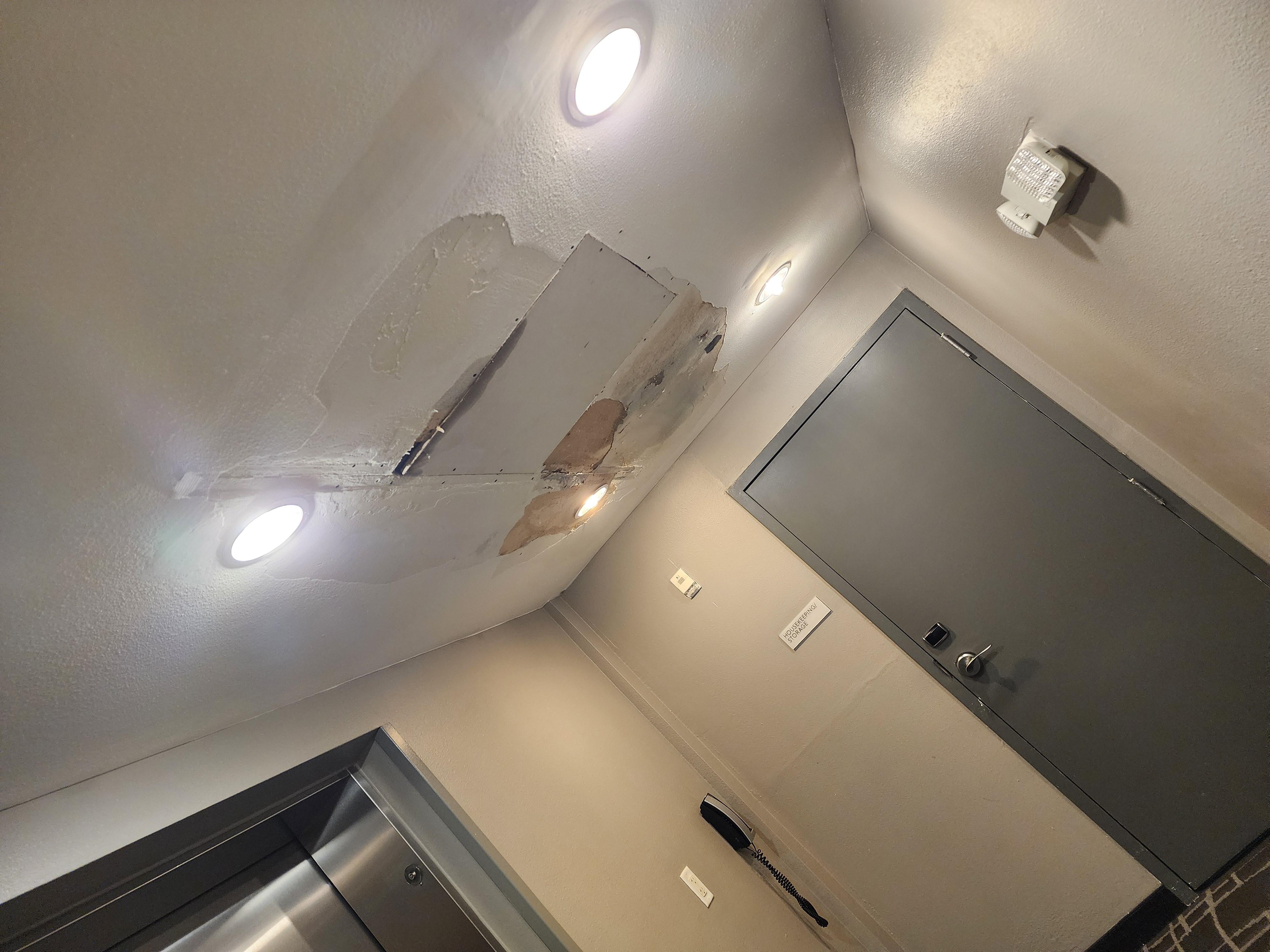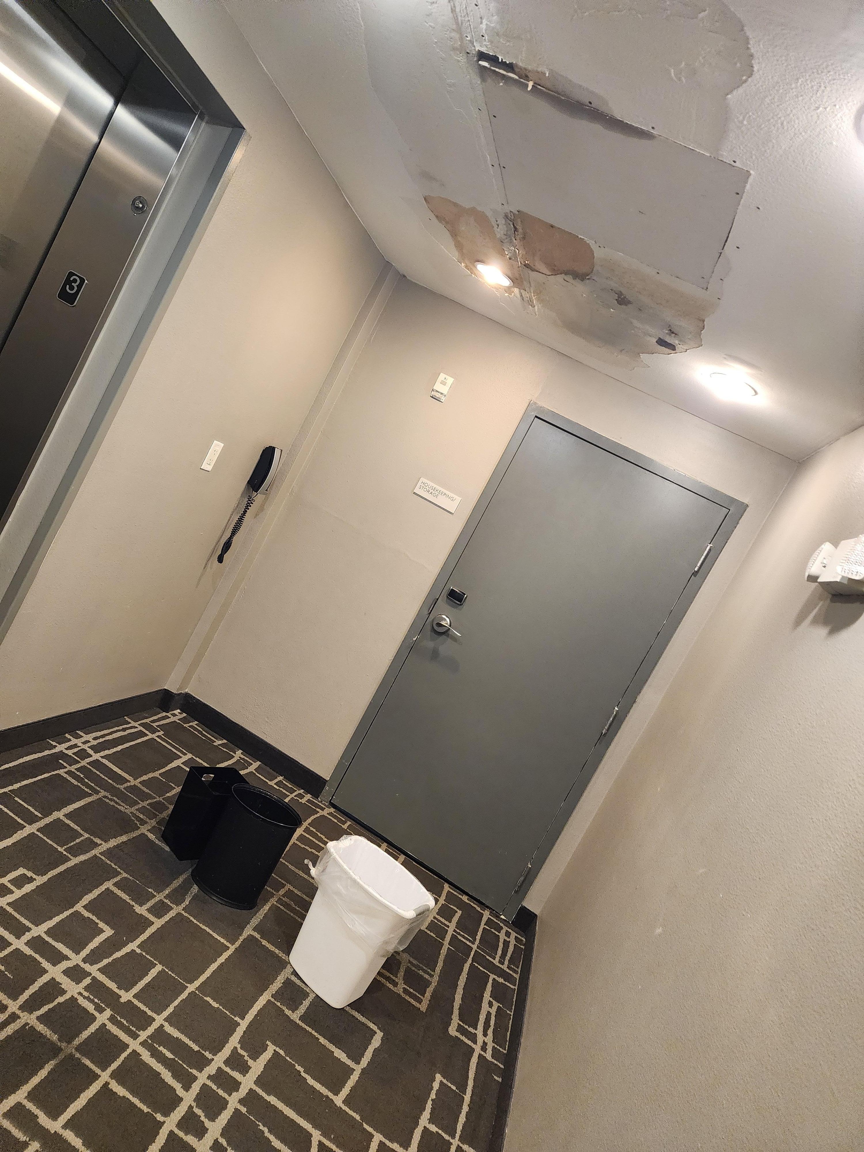 Room was clean. Staff was nice. Ceiling on the 3rd floor had a large leak. 3 trash cans to catch the water. Fire alarm went off 3 times starting at 3:30am until 4am.