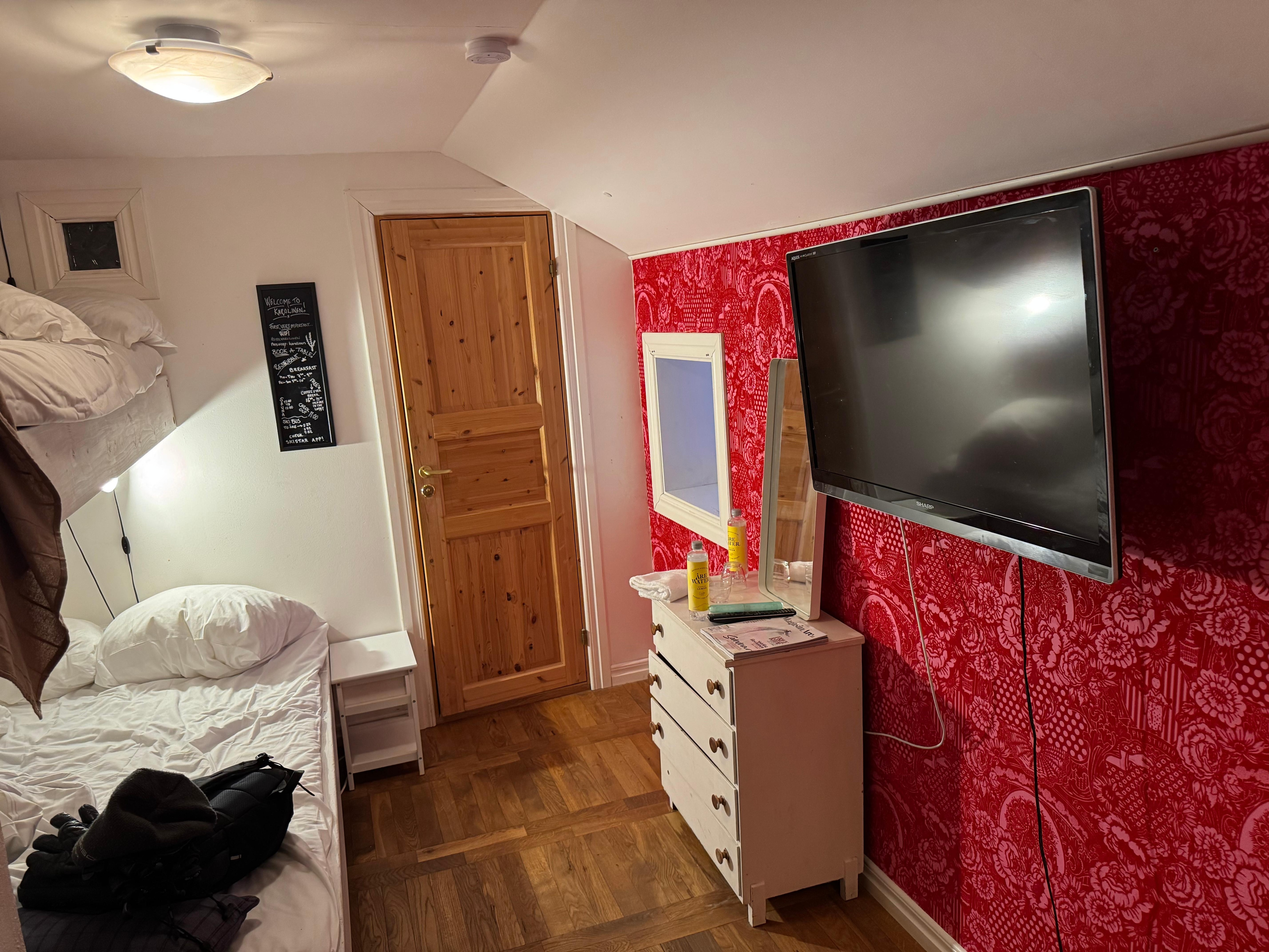 Trevligt familjärt äldre hotell, charmigt. Vi hade ett stort rum, rum nr 7. Sängen var tyvärr hård, då bäddmadrass saknades, endast ett tunt madrasskydd. Enligt personalen skall detta ses över. Mycket trevlig personal. Skidbuss går en liten bit från hotellet, fungerade bra. Trafikerad väg att gå en kort bit. Bra frukost med allt man behöver.