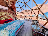 This stay is a one of a kind experience, my room was Panoramic #16. Well- glass bubble domes, with panels that open for fresh air. Comfortable bed, very clean, AC & heat worked. Curtains were easily opened and closed to shut out the light or viewing of your room. Had 2 small waters, tea, coffee, and toiletries. Very nice deck with chairs to sit and enjoy the incredible Mars like landscape. Cafe is gorgeous, and had great service, including Hookahs. Breakfast & Dinner very delicious. Easy to walk the grounds; helpful staff. Bonfire every evening offering Bedouin tea & socializing.